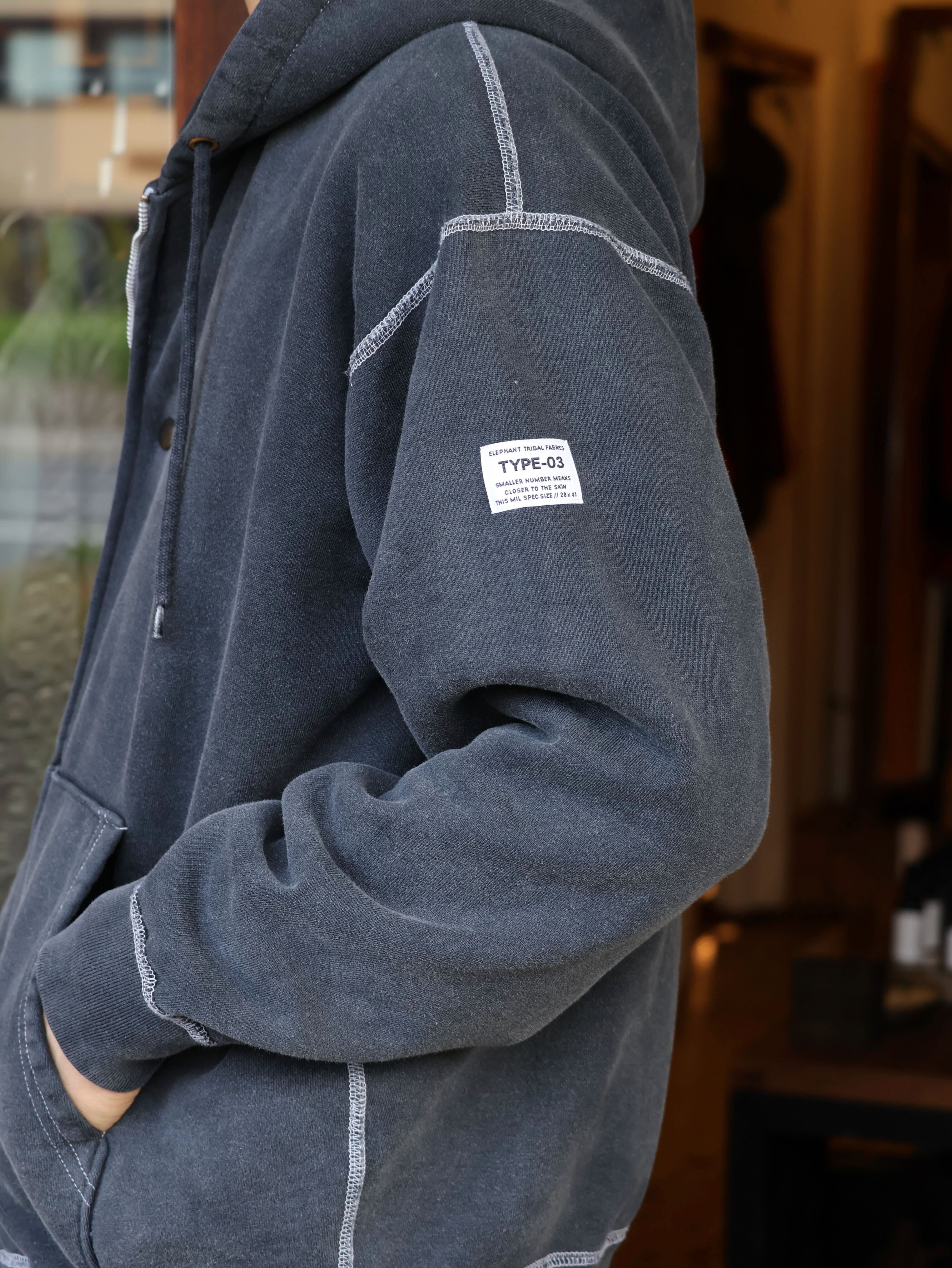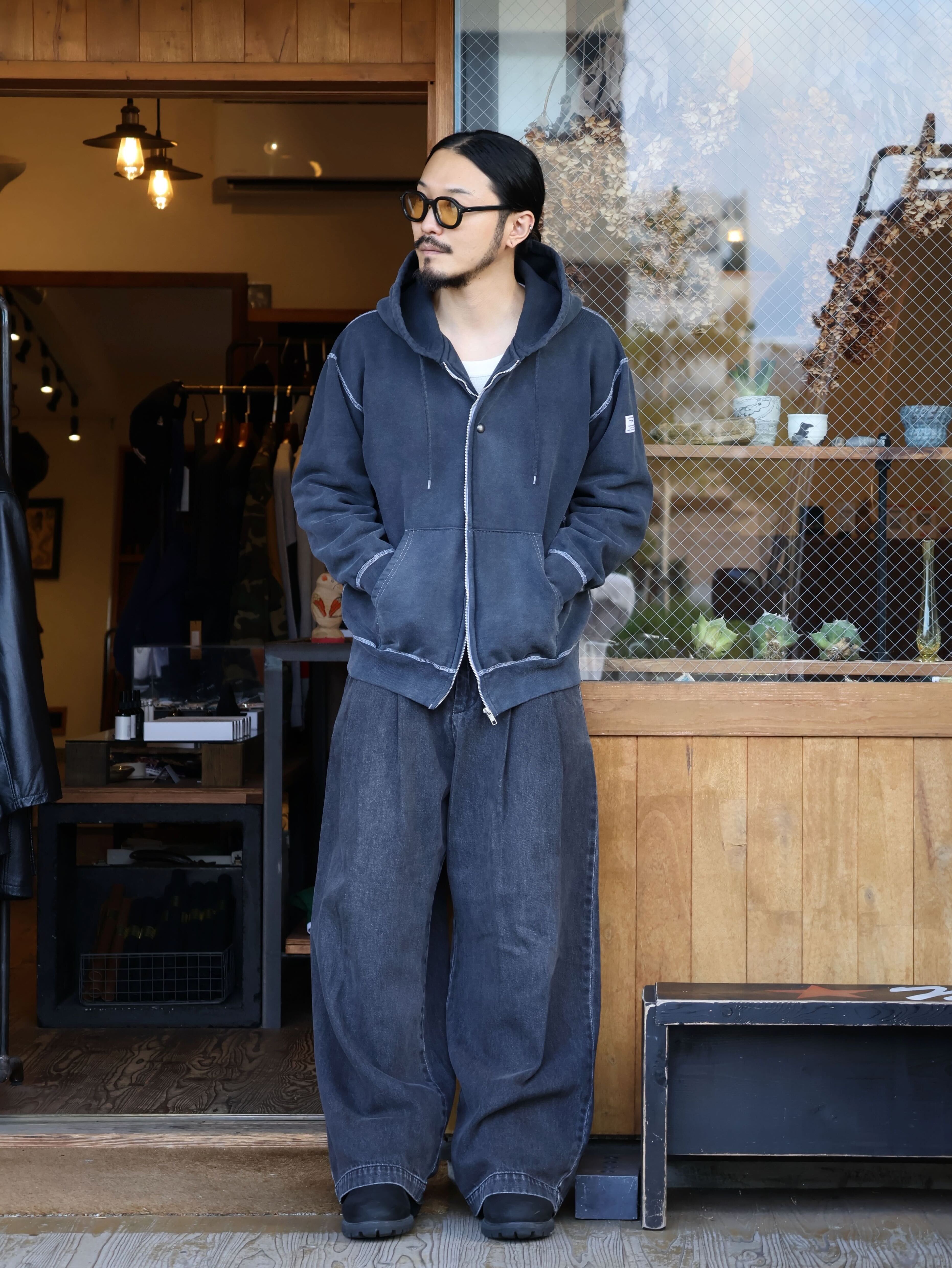 製品後、硫化染めを施し更にブリーチをナノサイズにしたミストで追い加工を施した細かなフェード感のあるアイテム。