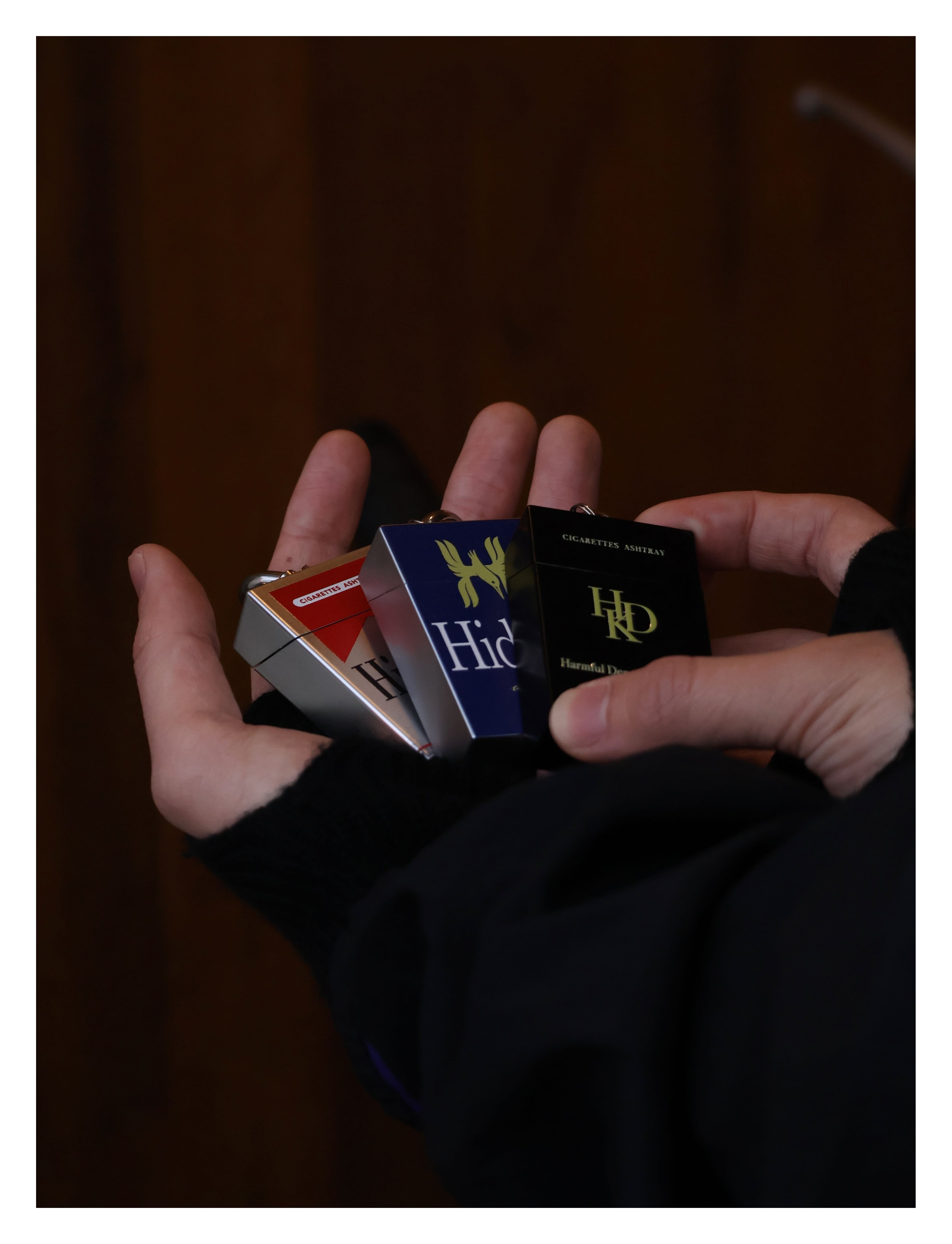 JPSのパッケージをサンプリングした携帯灰皿。カラビナを上に引き上げ ることで開閉可能です。HDKの頭文字を取ったHarmful Dependency Kill s(有害な依存による死亡)のスローガンがプリントされており喫煙の有 害性を示唆している。