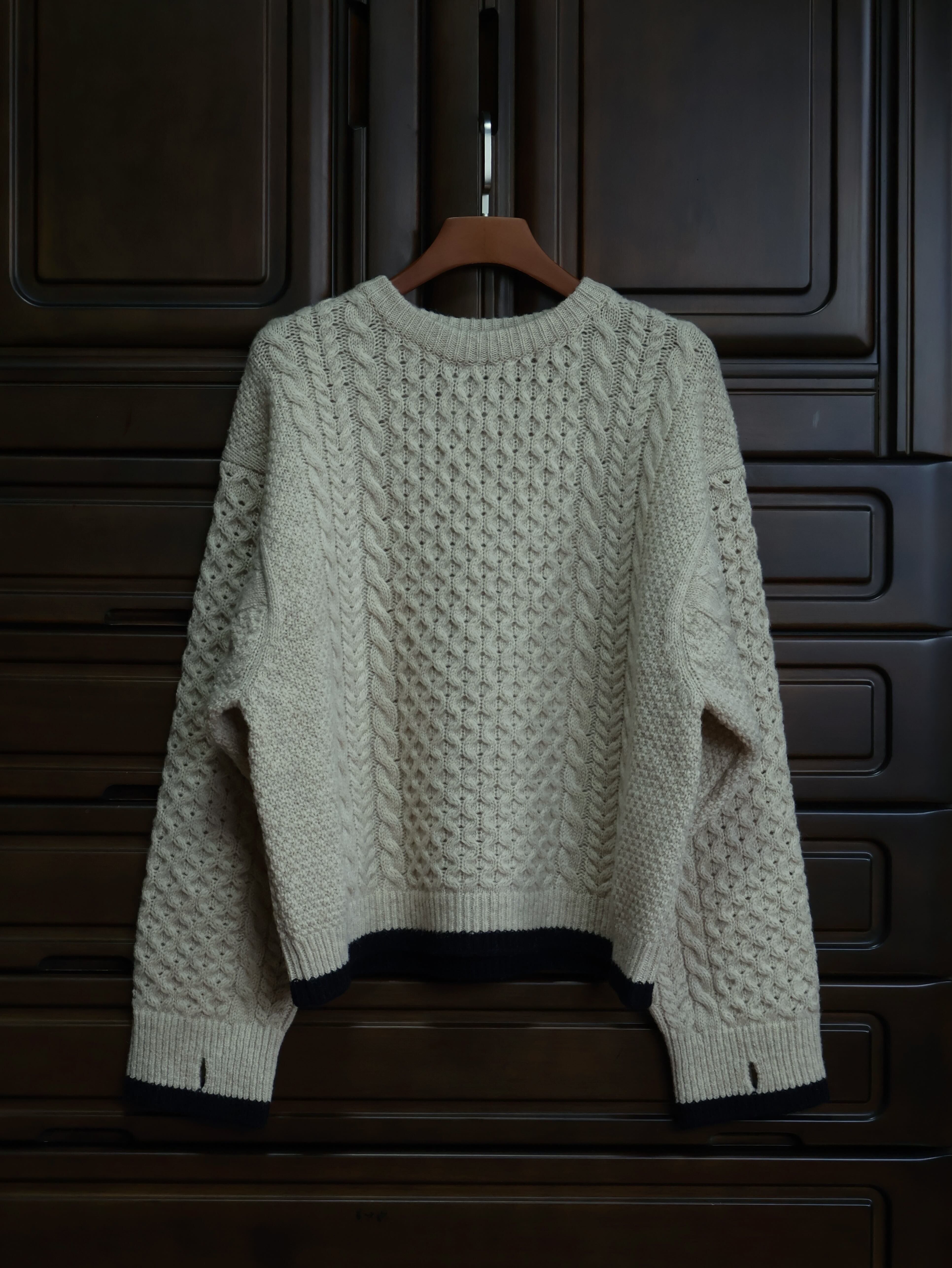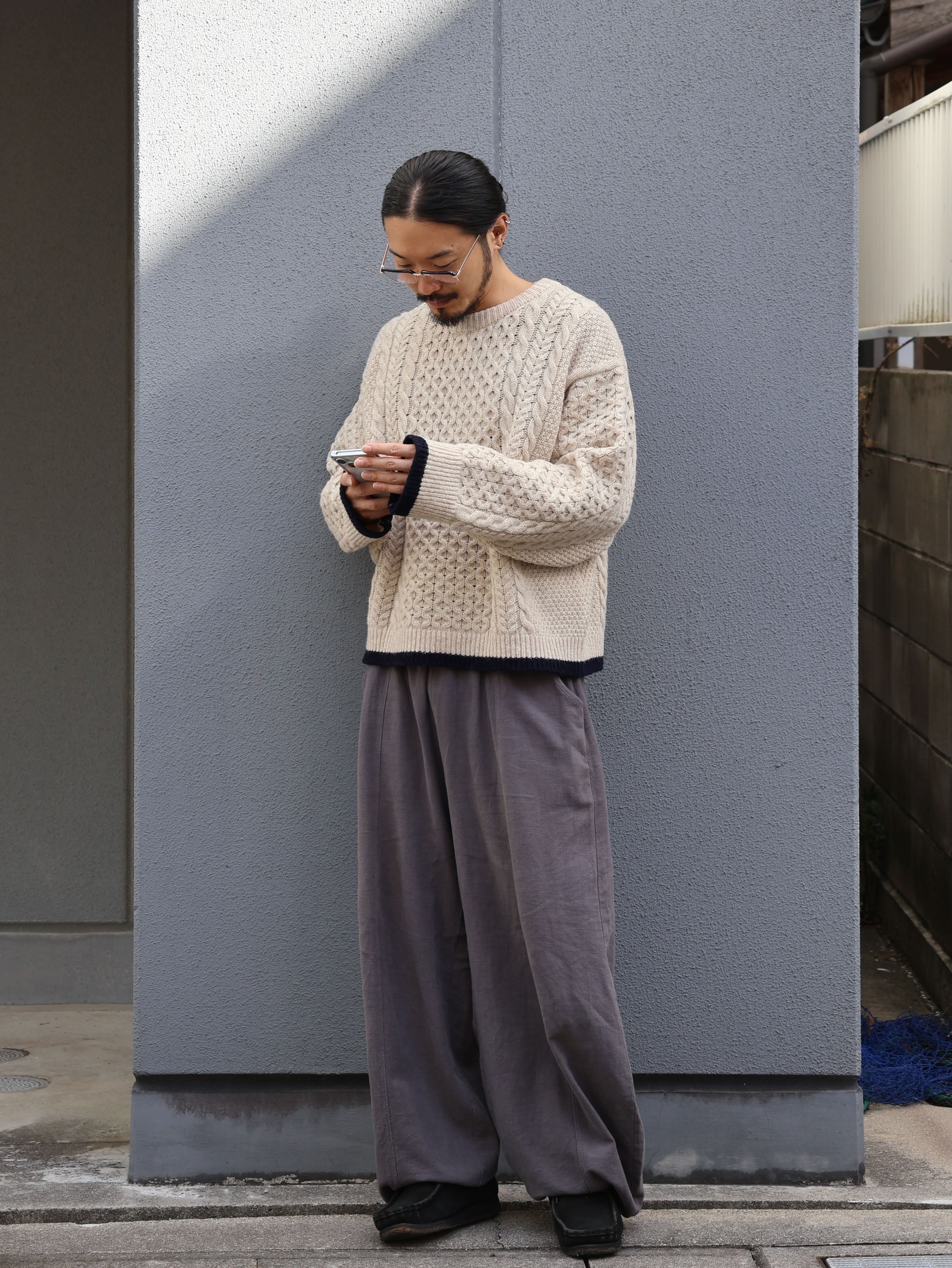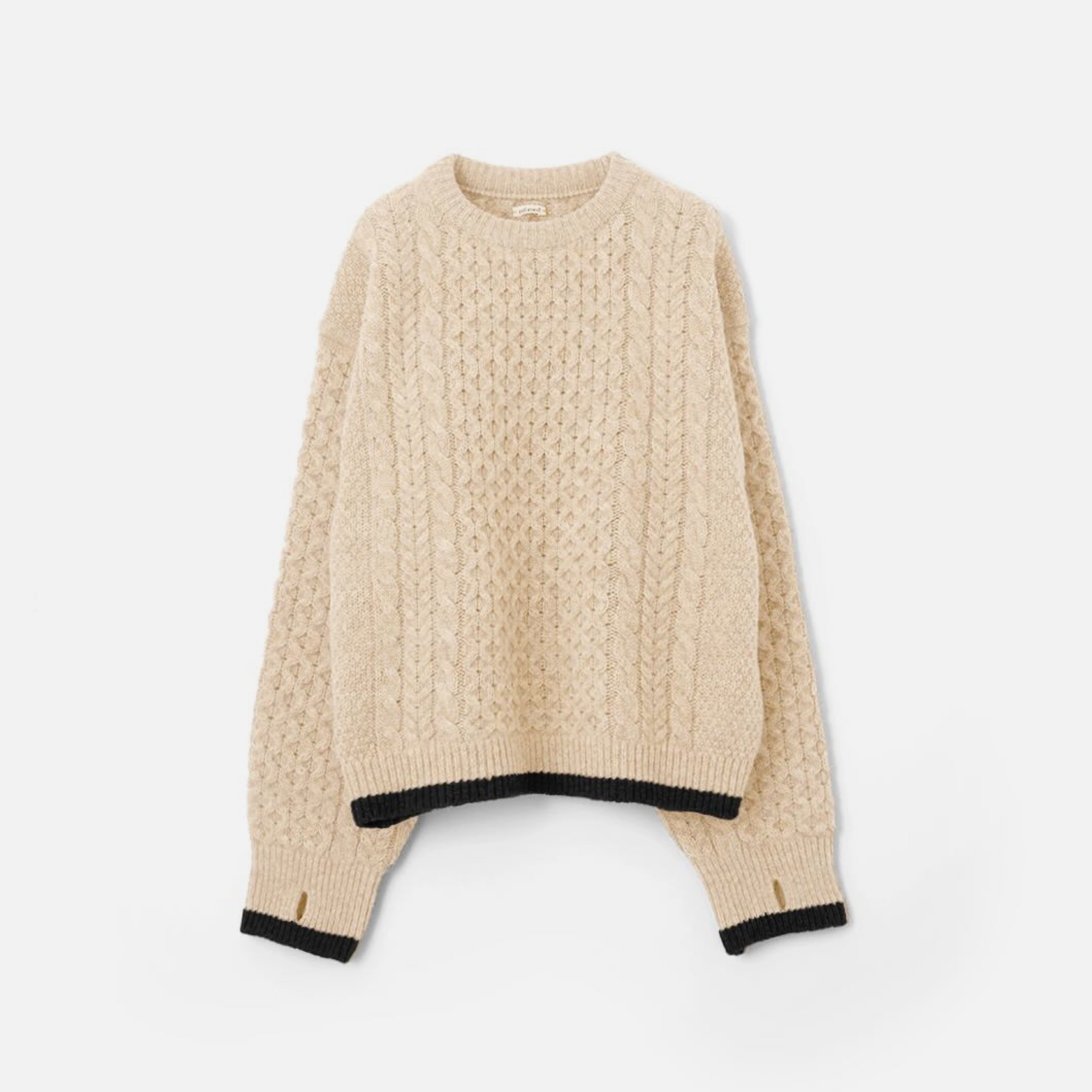 作業現場において欠かせない存在である"軍手"をイメージしたプルオーバーニット。作業環境によっては、安全上の理由から目立つ色を選ぶことが必要な場合があり、汚れが目立ちにくい色や、日焼けしにくい色を選ぶこともあります。企業や組織の規定に従って特定の色を選ぶ場合もあり、職人の軍手の色の選び方は様々で面白いです。糸はハリのあるドライな風合いのウール糸を使用し ています。ハリのある素材がケーブル編みを際立たせています。