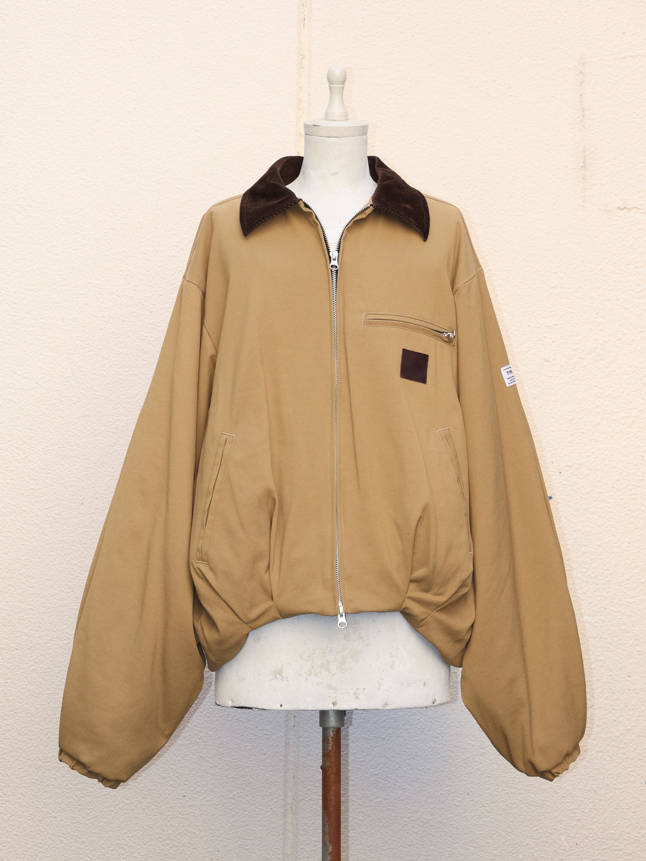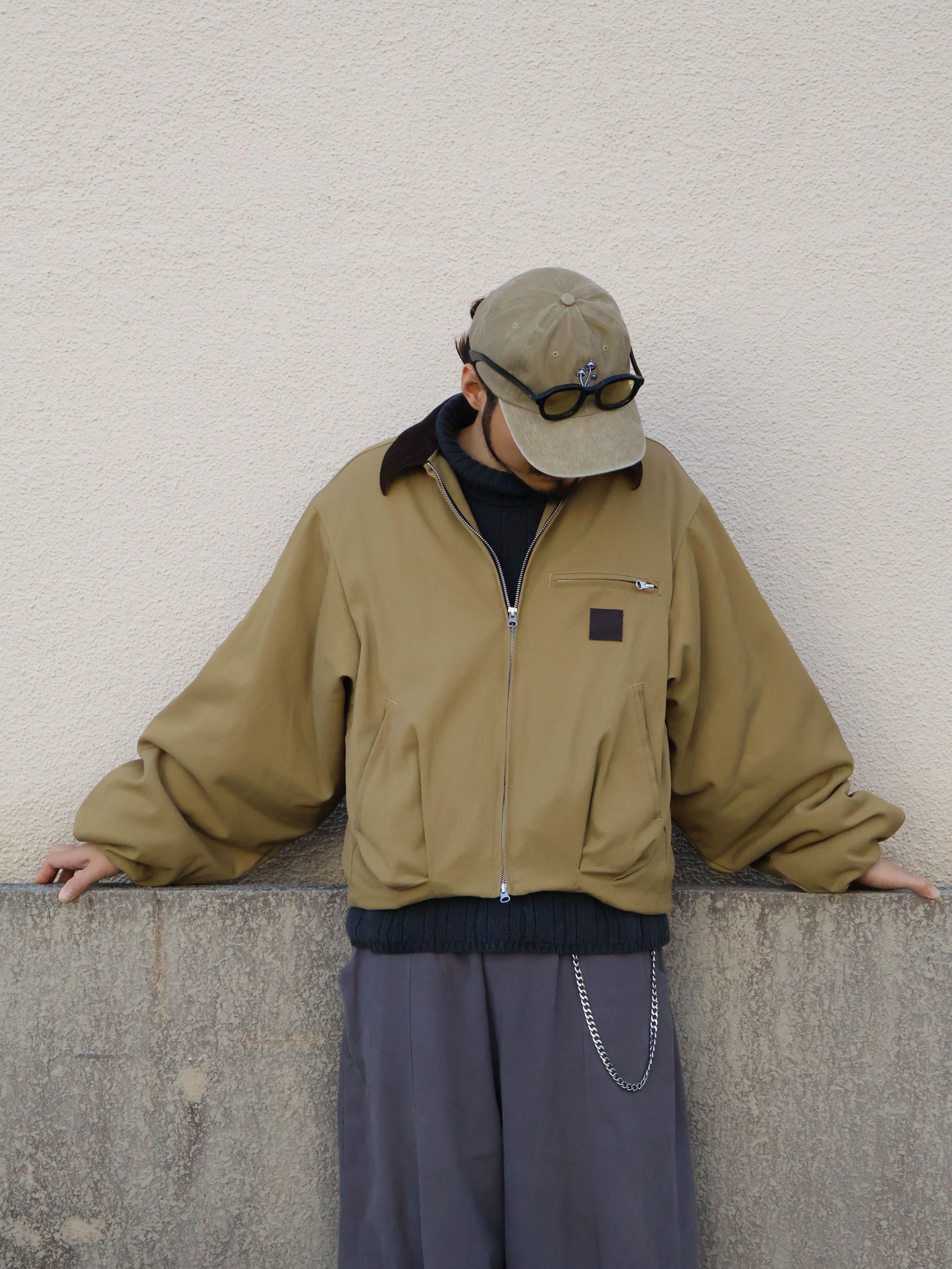 身頃裾、袖口部分に大振りなタックを配置し、本来のソレとは真逆のドレープ感のある柔らかな表情にパターンメイク。