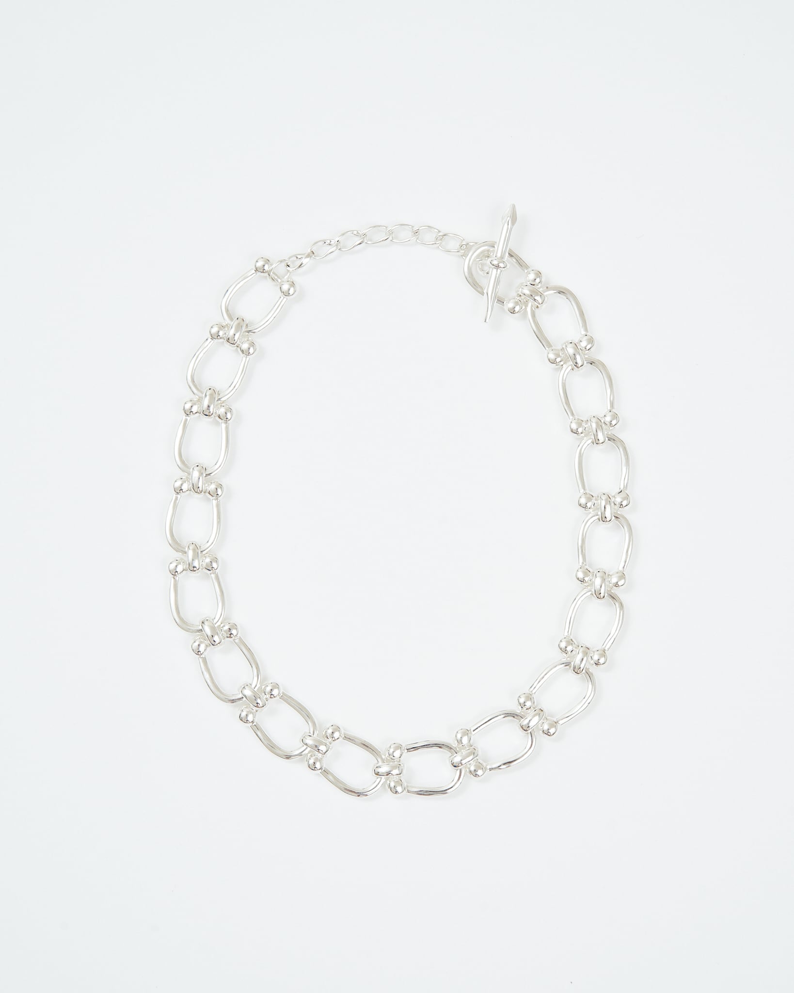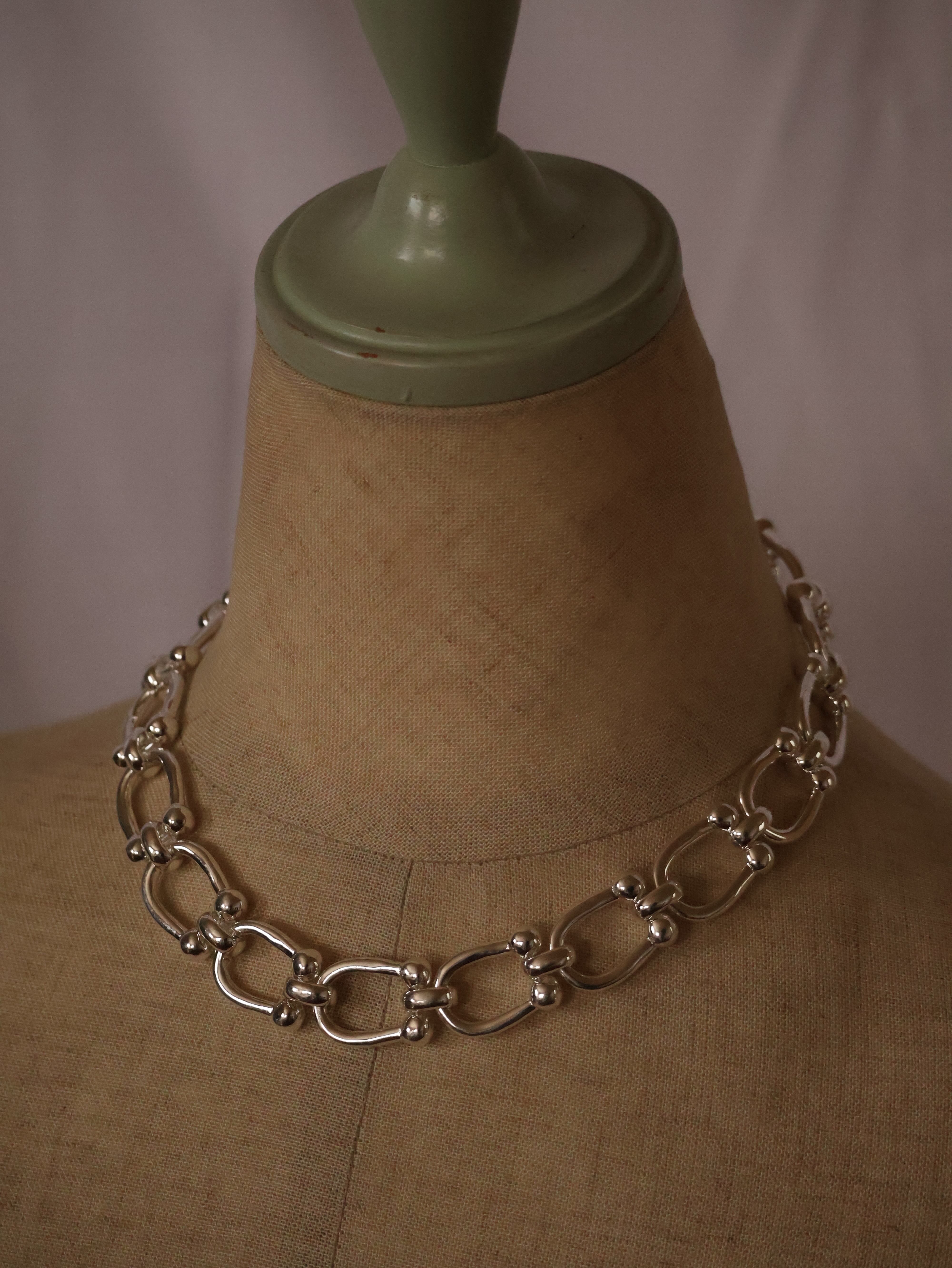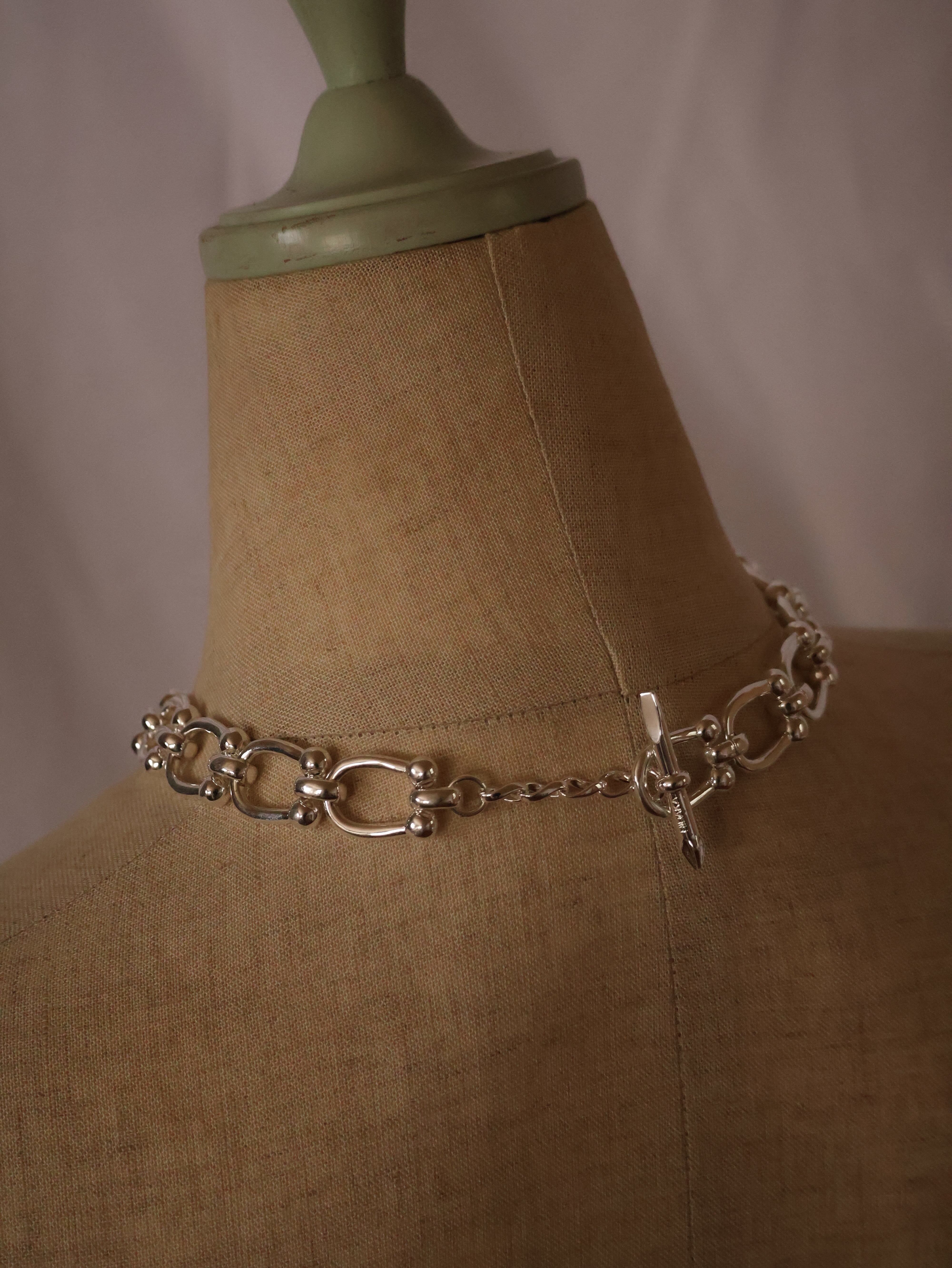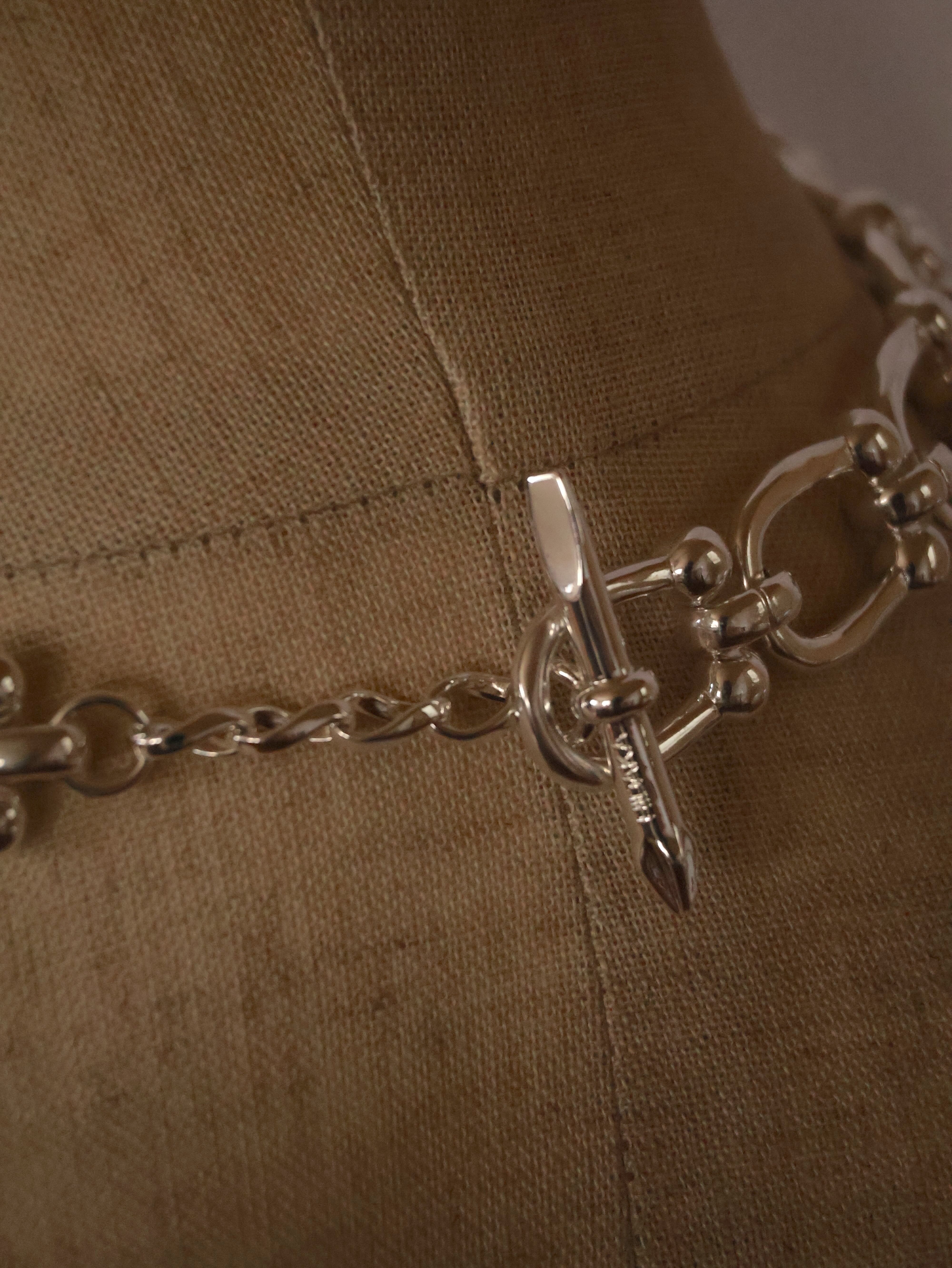 X線没収品を再解釈する〈Confiscation Objects〉シリーズから、ドライバ ービットをTバーに転用したチェーンネックレス。コッパー製のボリュームチェーンにSV925厚メッキを施し、工具の無骨さとジュエリーの質感を一体化。ビット先端をリングに通すワンアクションで着脱可能。日常には持ち込みにくいツールをジュエリーへ転換した、機能と装飾の境界を曖昧にするHIDAKAらしい一本です。